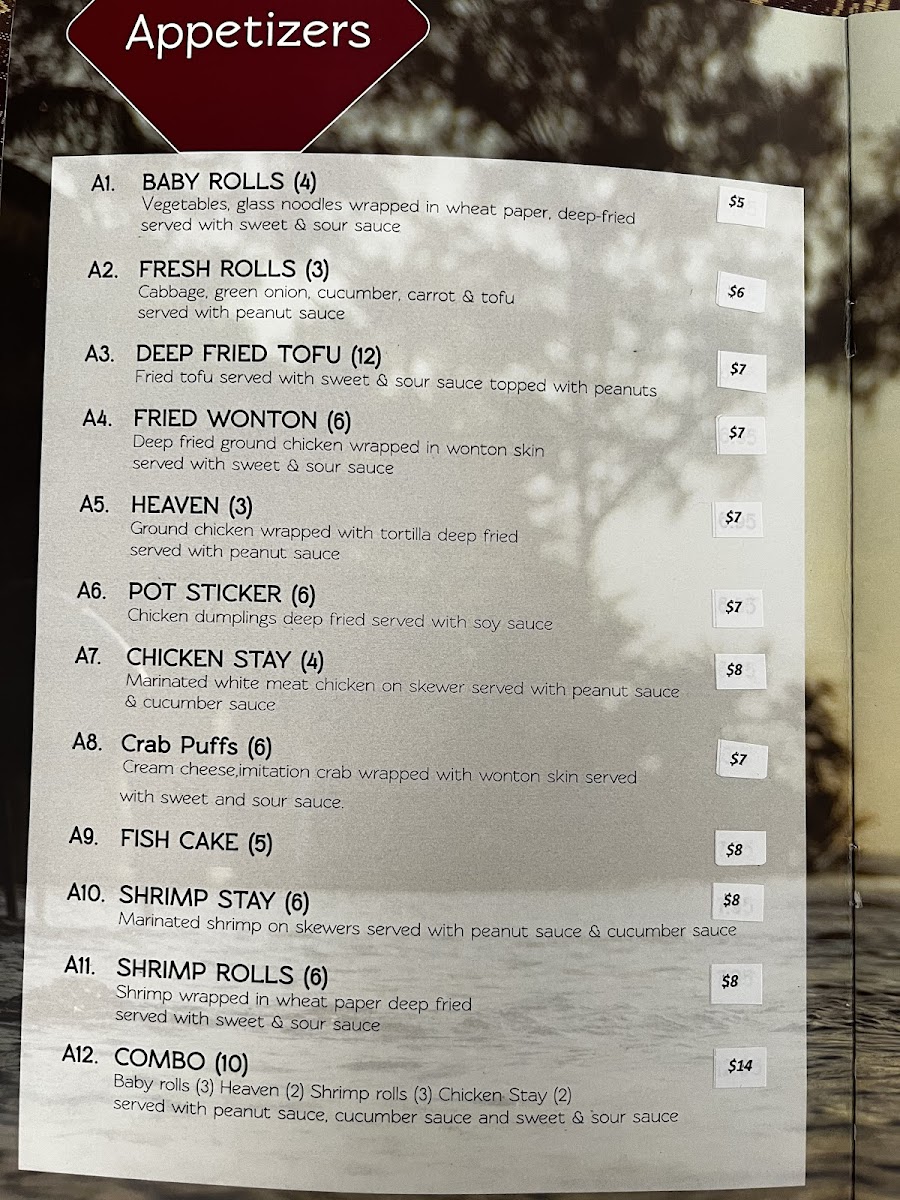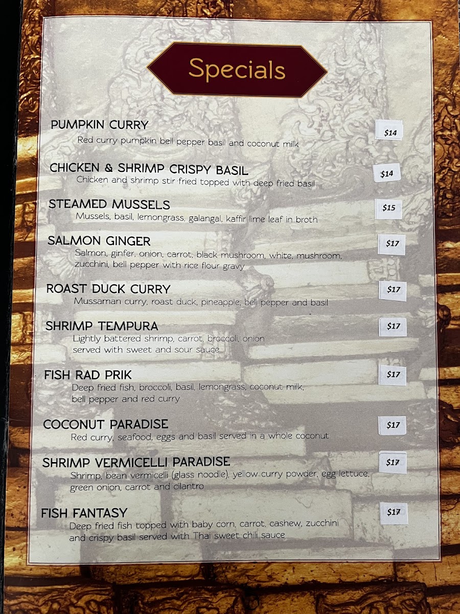 For seafood lovers, the Seafood Prik Phao showcases shrimp, squid, and mussels in a medley of vegetables for $17. Appetizers like Crab Puffs and Fried Wontons tantalize the palate, while the comforting Tom Yum Goong soup brings a burst of lemongrass and shrimp to the table. Pair your meal with the ever-popular Mango Sticky Rice for a sweet finish. Every dish evokes warmth and authenticity, promising a memorable culinary experience.
